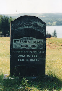 On June 9, 1924, Ernest was admitted to the Nova Scotia Sanatorium, Kentville, for treatment of pulmonary tuberculosis. Over the next eight months, his health worsened. Private Ernest Clare Simpson died in the Nova Scotia Sanatorium on February 9, 1925. His remains were transported to Boylston, where he was laid to rest in the Baptist Church Cemetery.